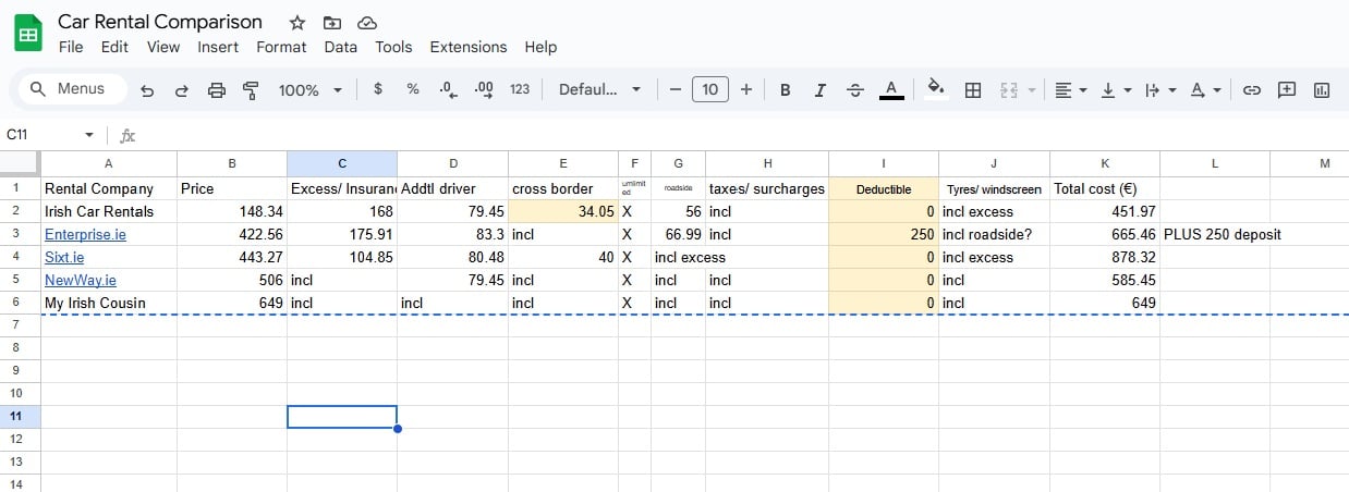 - In my spreadsheet, Irish Car Rentals came out least expensive once everything I needed was added.